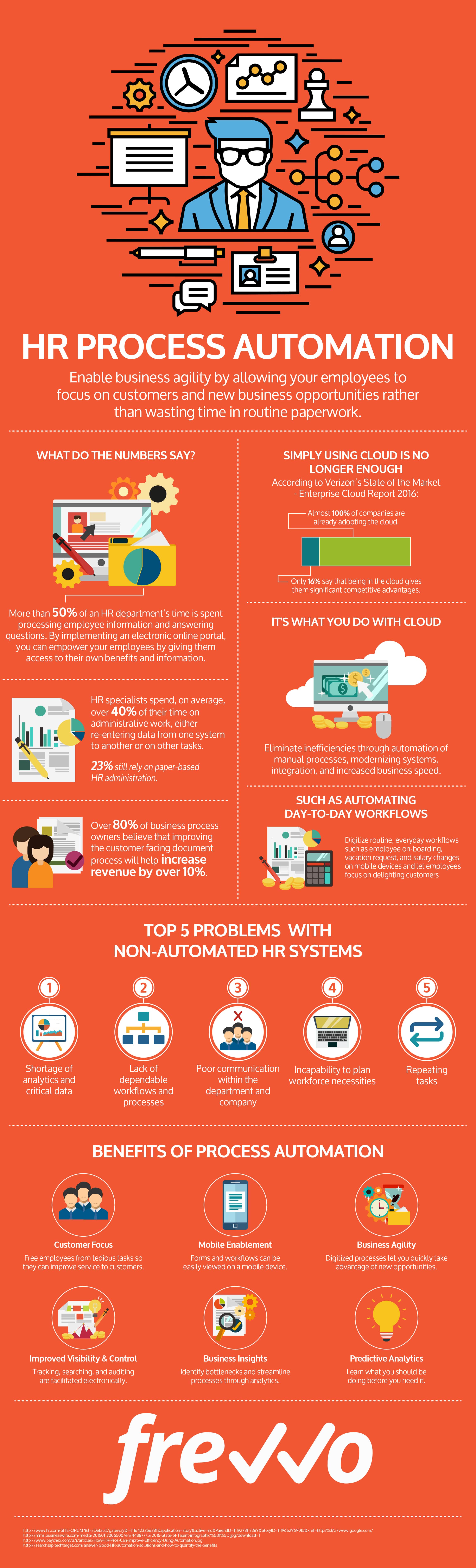 Customers large and small are using frevvo's visual, drag-and-drop designers to digitize their human resources forms and processes including new hire on-boarding, vacation request forms, and performance reviews. In this infographic, we discuss how automating everyday HR processes helps you reduce costs and focus your people on the tasks that matter – talent acquisition and retention.